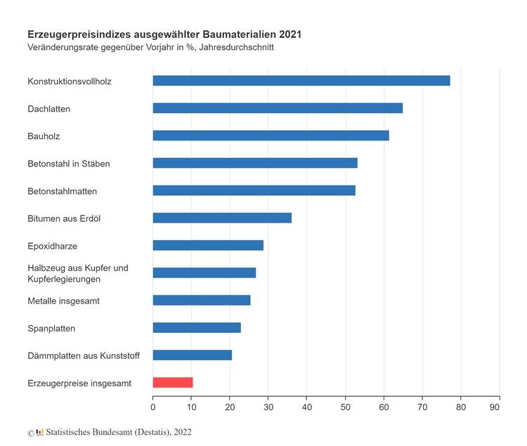 Lieferengpässe, Rohstoffknappheit, erhöhte Nachfrage im In- und Ausland haben sich auf den Bausektor ausgewirkt: Bauen ist im Jahr 2021 deutlich teurer geworden. Wie das Statistische Bundesamt (Destatis) mitteilt, stiegen die Erzeugerpreise für einzelne Baustoffe wie Holz und Stahl im Jahresdurchschnitt 2021 so stark wie noch nie seit Beginn der Erhebung im Jahr 1949. So verteuerte sich Konstruktionsvollholz um 77,3 % gegenüber dem Vorjahresdurchschnitt, Dachlatten um 65,1 %, Bauholz um 61,4 %. Selbst die Preise für Spanplatten, für die in der Regel das Abfallprodukt Sägespäne genutzt wird, stiegen um 23,0 %. Zum Vergleich: Der Erzeugerpreisindex gewerblicher Produkte insgesamt legte im Jahresdurchschnitt 2021 um 10,5 % gegenüber 2020 zu.