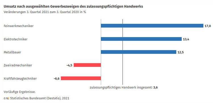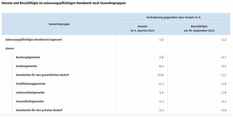 Im 3. Quartal 2021 sind die Umsätze im zulassungspflichtigen Handwerk in Deutschland gegenüber dem 3. Quartal 2020 um 3,6 % gestiegen. Nach einer deutlichen Erholung (+11,4 %) im 2. Quartal 2021 gegenüber dem Vorjahresquartal setzt sich die positive Entwicklung damit fort.