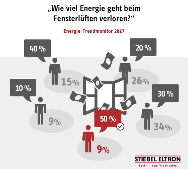 Die Verbraucher in Deutschland schätzen den Energieverlust beim Fensterlüften falsch ein: Nur knapp jedem zehnten Bundesbürger ist klar, dass beim Luftaustausch über die Fenster die Hälfte der Wärmeenergie aus dem Raum entweicht. Gleichzeitig fehlt 72% das Wissen über die Risiken von Schimmelbildung durch Feuchtigkeit. Das sind Ergebnisse des Stiebel Eltron Energie-Trendmonitors 2017. Dafür wurden 1.000 Bundesbürger bevölkerungsrepräsentativ befragt.