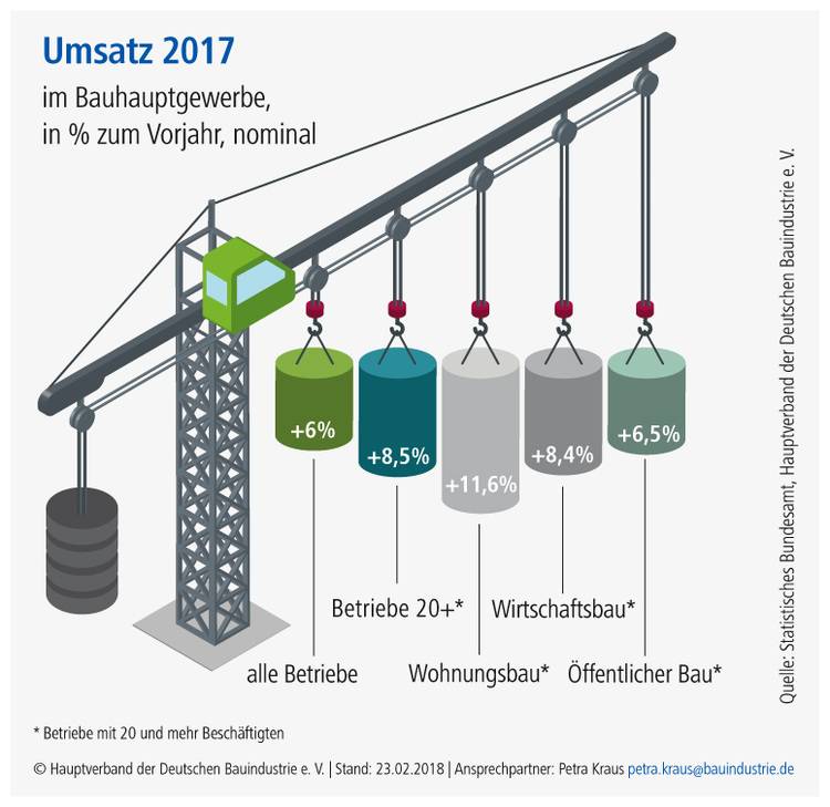 Das deutsche Bauhauptgewerbe schließt das Baujahr 2017 mit einem Umsatzplus von nominal 6,0 % ab (real: + 2,7 %). Damit übertrifft das Jahresergebnis die Verbandsprognose von + 5 %. Die Branche erwirtschaftete einen baugewerblichen Umsatz von 114 Mrd. Euro. Dies teilte der Hauptverband der Deutschen Bauindustrie (HDB) mit. Die größeren Baubetriebe mit 20 und mehr Beschäftigten meldeten sogar ein Umsatzplus von 8,5 % (real: + 5,1 %). Von der guten Baukonjunktur haben 2017 somit die größeren Betriebe überdurchschnittlich profitiert. Der Hauptverband führt dies darauf zurück, dass der Konjunkturaufschwung vor allem vom Neubau getragen wird, kleinere Unternehmen aber eher bei Baumaßnahmen im Bestand gefragt sind. Hinzu kommt, dass die Kleinbetriebe mit 1 bis 19 Beschäftigten stärker von personellen Kapazitätsengpässen betroffen sind.