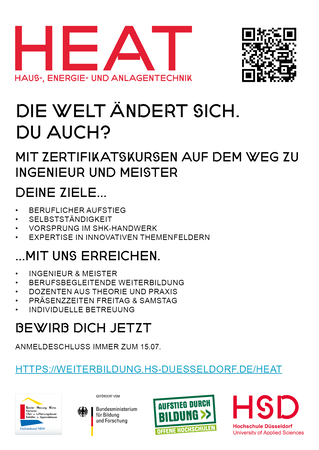 Der Anmeldezeitraum erstreckt sich vom 14. Mai 2019 bis zum 15. Juli 2019. In neun Semestern werden vier bis fünf Kurse pro Semester in SHK-spezifischen, ingenieurstechnischen sowie betriebswirtschaftlichen Bereichen angeboten. Zum Ende des Studiums können sich die Teilnehmer in ihren Interessensgebieten spezialisieren und das Studium mit der Bachelorarbeit abrunden. Die dafür anfallenden Kosten belaufen sich auf bis zu maximal 380 Euro monatlich. Alle weiteren Details sowie Eindrücke zu HEAT und Ansprechpartner finden Sie unter: https://weiterbildung.hs-duesseldorf.de/heat