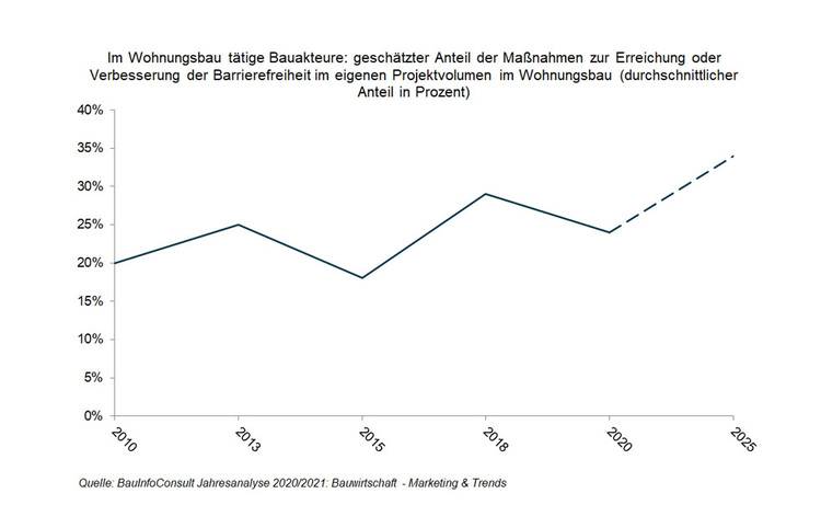 Aus diesem Grund können die Bauakteure zu Recht davon ausgehen, dass auch die Notwendigkeit zu mehr barrierefreien Bau- bzw. Modernisierungsmaßnahmen schon in naher Zukunft nicht mehr auf die lange Bank geschoben wird. Die Annahme der Bauakteure, dass schon 2025 der Anteil der barrierefreien Projekte in ihrem Portfolio ein gutes Drittel ausmachen wird (34 Prozent), ist daher alles andere als weit hergeholt.