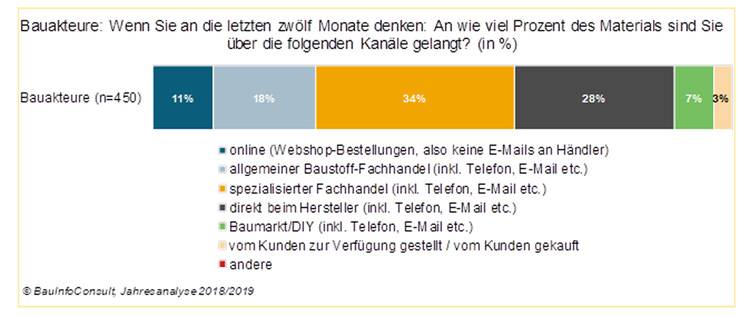 Im Rahmen der jährlichen Trendstudie Jahresanalyse des Düsseldorfer Marktforschungsinstituts wurden insgesamt 450 Bauunternehmer, Trockenbauer, Maler und SHK-Installateure in Telefoninterviews – um die Einschätzung gebeten, wie viel Prozent ihrer Materialeinkäufe in den vergangenen 12 Monaten jeweils über die unterschiedlichen Einkaufkanäle abgewickelt wurden. Dabei zeigt sich, dass über die Hälfte des bezogenen Materials (zusammengenommen 52%) im Fachhandel (spezialisierter und allgemeiner (Baustoff)-Fachhandel) erworben wurde – egal, ob nun durch eine Telefonbestellung, per Fax, per E-Mail oder klassisch vor Ort an der Laden-theke. Damit ist der spezialisierte Fachhandel immer noch die erste Adresse für viele Bauakteure.