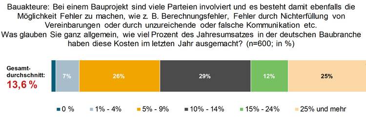 Neben der ärgerlich hohen Gesamtsumme, die jährlich im Fehlerkostenschlund verschwindet, spielt auch die Häufigkeit eine Rolle, in der Fehlerkosten entstehen. Hier sieht es aktuell auch nicht wesentlich besser aus, denn die befragten Bauakteure schätzen, dass in 10% der eigenen Bauprojekte Fehlerkosten produziert worden sind – zumindest für die in 2017 von ihnen durchgeführten Bauvorhaben.