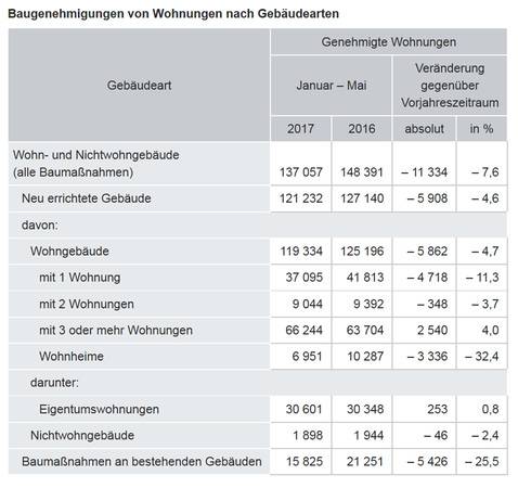 Die Zahl der Baugenehmigungen von Neubauwohnungen in Wohngebäuden insgesamt hat in den ersten fünf Monaten 2017 gegenüber dem Vorjahreszeitraum um 4,7% beziehungsweise 5900 Wohnungen abgenommen. Gegen den Trend stiegen dabei die Genehmigungen von Wohnungen in Mehrfamilienhäusern (+4,0% beziehungsweise + 2500 Wohnungen). Damit erreichte die Anzahl genehmigter Wohnungen in Mehrfamilienhäusern mit 66.200 Wohnungen den höchsten Wert in den ersten fünf Monaten eines Jahres seit 19 Jahren (1998: 67.400). Die Baugenehmigungen für Wohnungen in Einfamilienhäusern (– 11,3% beziehungsweise – 4700 Wohnungen) und in Zweifamilienhäusern (–3,7% beziehungsweise –300 Wohnungen) gingen dagegen zurück. Die Genehmigungen für Wohnungen in Wohnheimen sind ebenfalls gesunken (–32,4% beziehungsweise – 3300 Wohnungen). Zu dieser Kategorie zählen unter anderem Flüchtlingsunterkünfte. Die Zahl der Wohnungen, die durch in den ersten fünf Monaten 2017 genehmigte Um- und Ausbaumaßnahmen an bestehenden Gebäuden entstehen sollen, ging um 5400 Wohnungen beziehungsweise 25,5 % zurück.