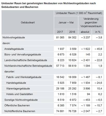 Der umbaute Raum der genehmigten neuen Nichtwohngebäude sank von Januar bis Mai 2017 gegenüber dem Vorjahreszeitraum um 3,2 Millionen Kubikmeter auf 81,1 Millionen Kubikmeter (–3,8%). Diese Entwicklung ist sowohl auf einen Rückgang der Genehmigungen bei den öffentlichen Bauherren (–15,7%) als auch bei den nichtöffentlichen Bauherren (–2,7%) zurückzuführen.