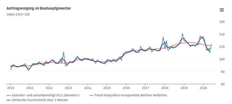 Der reale (preisbereinigte) Auftragseingang im Bauhauptgewerbe war nach Angaben des Statistischen Bundesamtes (Destatis) im Juni 2020 saison- und kalenderbereinigt 12,4% höher als im Mai 2020. Diese Entwicklung wurde in hohem Maße von Großaufträgen beeinflusst.