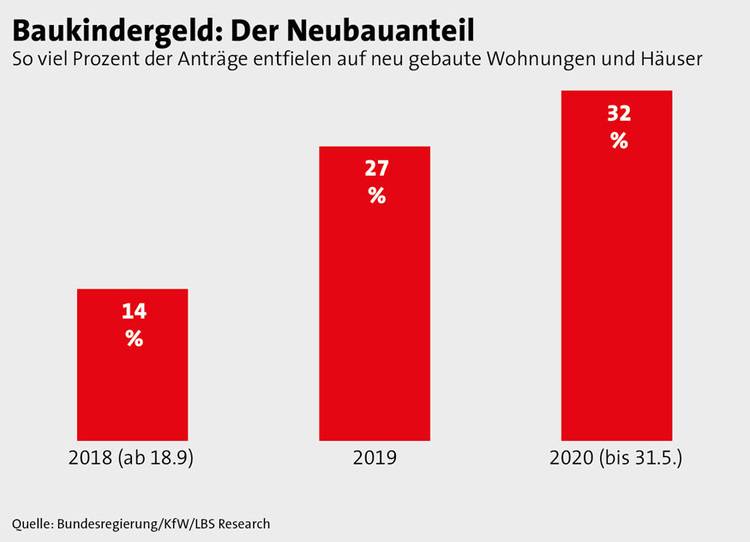 Lag der Neubauanteil an den Baukindergeldzusagen bis Ende 2018 nur bei 14 Prozent, waren es 2019 schon 27 Prozent und in den ersten fünf Monaten des Jahres 2020 nach Berechnungen von LBS Research sogar 32 Prozent.