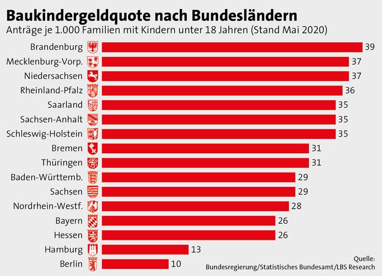In Brandenburg kamen auf 1.000 Familien mit minderjährigen Kindern 39 Anträge auf Baukindergeld, in Mecklenburg-Vorpommern 37 – und damit ein gutes beziehungsweise knappes Drittel mehr als im Bundesdurchschnitt, der bis Ende Mai bei 29 Anträgen lag.