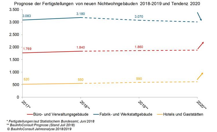 Aufgrund der überwiegend schwachen Genehmigungsentwicklung im vergangenen Jahr ist 2018 mit einem leicht negativen Ergebnis der Fertigstellungsziffern im Nichtwohnungsneubau zu rechnen (-1,9% weniger Fertigstellungen als 2017). Da die Genehmigungen in einigen Segmenten die vorige Baukonjunkturflaute wieder mehr auszugleichen scheinen, sollte die Fertigstellungsrate jedoch schon im Jahr 2019 wieder einen Schub von plus 4,8% bekommen. Danach ist der Baubedarf (Stand heute) bei den Unternehmen erfahrungsgemäß aber schon wieder gedeckt: Die Tendenz für den gesamten Nichtwohnungsbau zeigt schon ab 2020 wieder abwärts.