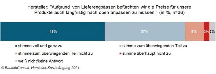 Die große Mehrheit der Hersteller geht sogar von langfristig wirkenden Preisanpassungen auf ihre Produkte aus (zu 86 Prozent). Und nur 12 Prozent der Befragten rechnen damit, dass es sich bei den derzeitigen Engpässen um ein vorübergehendes Phänomen handelt und gehen daher nicht von permanenten Preissteigerungen aus. Damit stehen den seit mehr als einem Jahrzehnt ohnehin schon steigenden Baupreisen womöglich auch von der Materialseite her zusätzliche Schübe nach oben ins Haus.