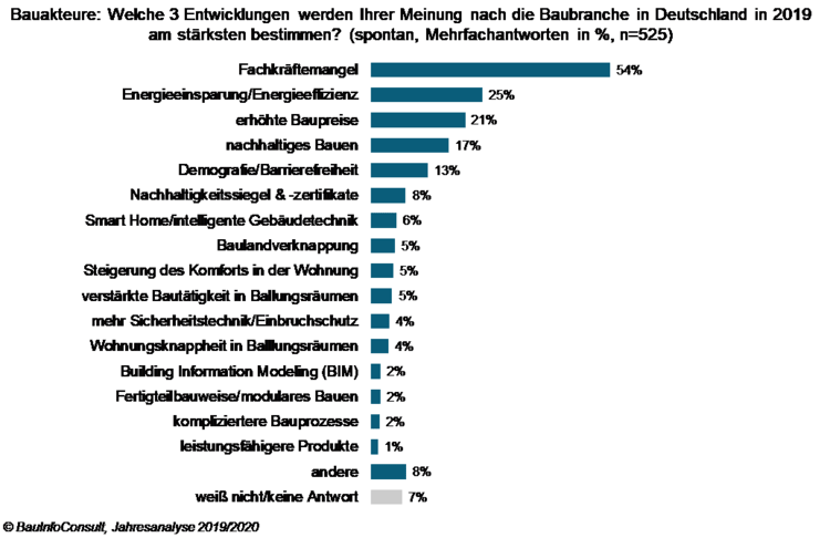 Es ist keine Überraschung, welche Entwicklung die Akteure der Baubranche in einer neuen Studie zum Top-Branchentrend 2019 gewählt haben: Der Fachkräftemangel bestimmt das Baugeschehen geradezu übermächtig und mehr als jeder Zweite am Bau sieht die Suche nach qualifizierten Mitarbeitern 2019 als allgegenwärtig an. Daneben dreht sich die Branche um ihren Beitrag zur Klimarettung – Themen wie nachhaltiges und energieeffizientes Bauen stehen ebenfalls an prominenter Stelle bei den Trends des Jahres. Dies zeigen Vorabergebnisse der BauInfoConsult Jahresanalyse 2019/2020, der zentralen Branchenstudie zum deutschen Baugeschehen.