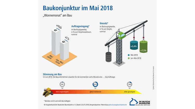 Wie der Hauptverband der Deutschen Bauindustrie mitteilt, lag der Auftragseingang der Betriebe des Bauhauptgewerbes mit 20 und mehr Beschäftigten im Mai um nominal 10,0 % über dem Niveau des vergleichbaren Vorjahresmonats. Auch im Vergleich zum Vormonat haben die Aufträge nach Berechnungen des Statistischen Bundesamtes (preis-, saison- und arbeitstäglich bereinigt) zugelegt, und zwar um 4,6 % - trotz des mittlerweile erreichten hohen Niveaus. Für den gesamten Zeitraum von Januar bis Mai ergibt sich ein Orderplus von 7,5 %.