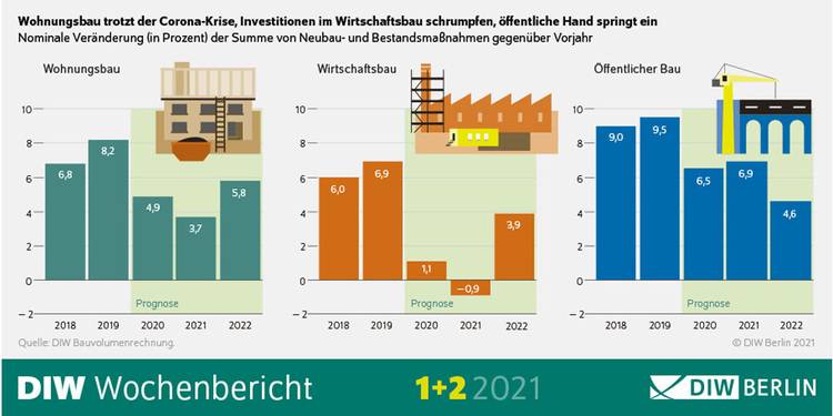 Die Bauwirtschaft ist in Deutschland bislang verhältnismäßig gut durch die Corona-Pandemie gekommen und dürfte auch in den nächsten Jahren solide Wachstumsraten verzeichnen. Das geht aus der neuesten Bauvolumenrechnung des Deutschen Instituts für Wirtschaftsforschung (DIW Berlin) hervor.