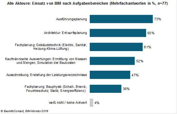 Die aktuelle BIM-Praxis zeigt jedoch, dass die heute schon BIM-nutzenden Akteuren in ihren eigenen BIM-Projekten mehrheitlich die Ausführungsplanung (73 Prozent), die architektonischen Entwurfsplanung (65 Prozent) sowie die gebäudetechnischen Fachplanung (61 Prozent) nach der BIM-Methode organisieren.