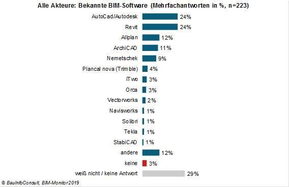Allerdings zeigt die Untersuchung, dass je nach Anwendergruppe und Aufgabenstellung innerhalb des BIM-Prozesses verschiedene Softwares zum Einsatz kommen: So nutzen die Architekten unter den BIM-Usern momentan während der architektonischen Entwurfsplanung insbesondere Archicad von Graphisoft, während sie beispielsweise bei der Ermittlung von Massen/Mengen und Baukosten auf die Plattform von Orca zurückgreifen. Bei den anderen Berufsgruppen deuten die Ergebnisse jedoch auf andere Platzhirsche unter den Softwareentwicklern hin.