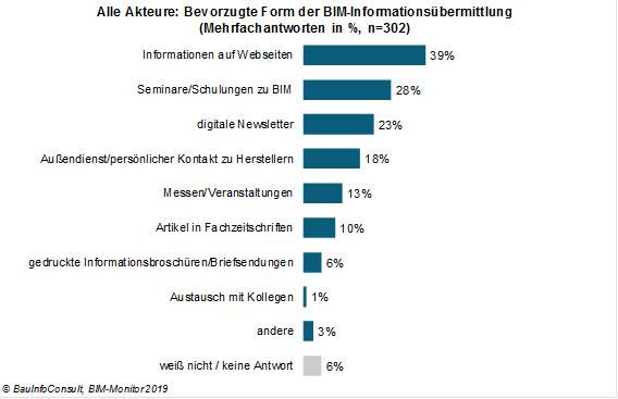 Wenn es darum geht, in welcher Form die Interviewten ihre BIM-Informationen am liebsten erhalten würden, verschieben sich die Informationswege etwas. Vor allem die BIM-Nichtnutzer informieren sich am liebsten selbstständig und unverbindlich im Internet über BIM – meistens ganz allgemein auf den unterschiedlichen Webseiten. Bei den BIM-Nutzern spielt der direkte Austausch mit den Anbietern in Schulungen und Seminaren indes eine größere Rolle. Daneben wurden zusätzlich auch Newsletter und der Außendienstbesuch als bevorzugte Informationskanäle angegeben.