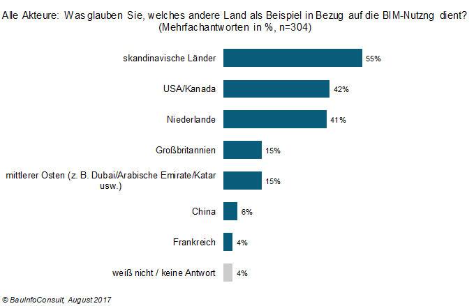 BauInfoConsult ist in seiner Trendstudie BIM Monitor 2017 unter anderem genau dieser Frage nachgegangen. Dabei zeigen die Ergebnisse, dass die deutschen Akteure insbesondere die skandinavischen Staaten als Paradebeispiel für die BIM-Nutzung erachten. Aber auch andere Staaten kommen für die Befragten als Vorbilder in Frage.