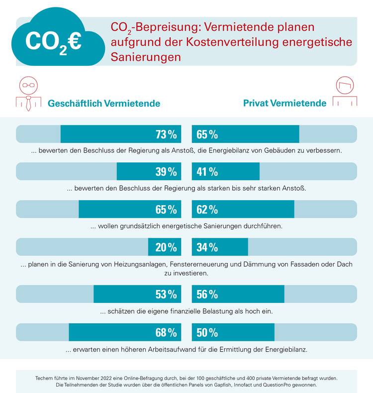 Marktforschungsdaten von Techem, einem Service-Anbieter für grüne und smarte Gebäude, zeigen, dass 73 Prozent der geschäftlichen und 65 Prozent der privaten Vermietenden den Beschluss der Regierung als Anstoß bewerten, die Energiebilanz von Gebäuden zu verbessern. Rund jeder Vierte (geschäftlich: 39 Prozent, privat: 41 Prozent) bewertet diesen sogar als stark bis sehr stark.
