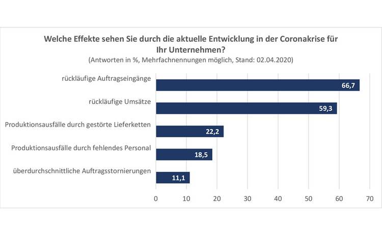 Ein Blick auf die Auftragseingänge bestätigt das: hier melden bereits zwei von drei Unternehmen Rückgänge in Höhe von durchschnittlich rund 22 Prozent. Jeder neunte Befragungsteilnehmer meldet bereits jetzt Auftragsstornierungen über das übliche Maß hinaus.