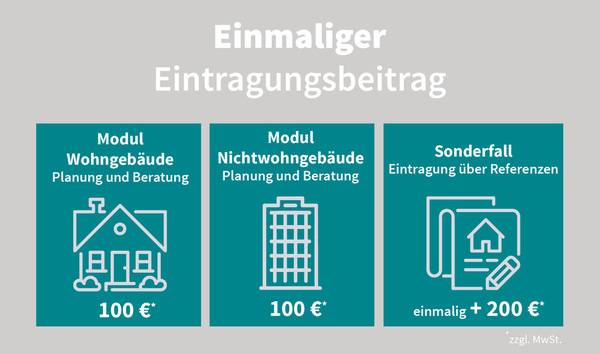 Für neue Listeneinträge fallen pro Modul zusätzlich Kosten von 100 Euro (netto) an, eine Eintragung über Gebäudereferenzen kostet in der neuen Beitragsstruktur einmalig 200 Euro (netto), da die Prüfung von Referenzen zeitaufwendiger als die Prüfung von Weiterbildungszeugnissen ist.