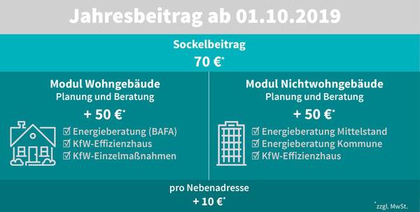 Für rund 80 % der bereits eingetragenen etwa 12.000 Energieeffizienz-Experten – sie sind ausschließlich für Förderprogramme eines Moduls (Wohngebäude oder Nichtwohngebäude) in der Expertenliste eingetragen – bedeutet die neue Preisstruktur eine Erhöhung des Jahresbeitrags von 100 auf 120 Euro (netto, zzgl. 19 % MwSt.). Für Experten, die sich zunächst für Wohngebäude eingetragen und sich später kostenfrei auch als Experte für Nichtwohngebäude haben listen lassen, steigt der Jahresbeitrag von 100 auf 170 Euro (netto, zzgl. 19 % MwSt.). Die neue Preisstruktur basiert auf einem Sockelbeitrag von 70 Euro/a (netto) und 50 Euro/a (netto) für jedes Modul. Nebenadressen kosten zukünftig 10 Euro/a (netto).