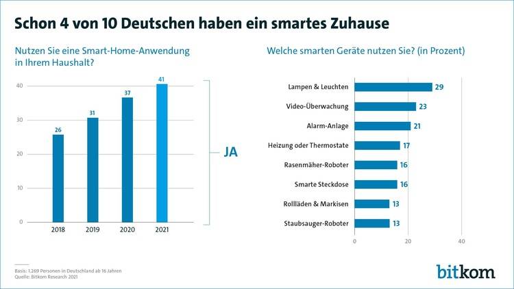 Mittlerweile verfügen 41 Prozent über vernetzte Geräte in ihrem Zuhause. 2020 waren es noch 37 Prozent und 31 Prozent im Jahr 2019. Das ist das Ergebnis einer repräsentativen Befragung unter 1.269 Personen in Deutschland ab 16 Jahren, die im Auftrag des Digitalverbands Bitkom durchgeführt wurde. Die meistgenutzte Anwendung sind demnach intelligente Lampen und Leuchten, die bereits 29 Prozent der Bundesbürgerinnen und Bundesbürger im Einsatz haben – ein Plus von 6 Prozentpunkten (2020: 23 Prozent).