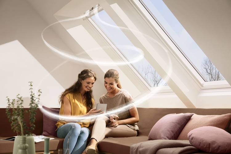 Für Bauherren, die den Luftwechsel besonders energieeffizient sicherstellen wollen, gibt es auch Fensterlüfter mit Wärmerückgewinnung, wie etwa „Smart Ventilation“ für Velux Dachfenster: Das nachrüstbare Zubehör wird außen oben am Dachfenster montiert und sorgt dafür, dass ein konstanter Luftaustausch stattfindet – auch bei geschlossenem Fenster. Die Wärme geht dabei nicht mit der abziehenden Raumluft verloren, sondern wird zu 81% zurückgewonnen.