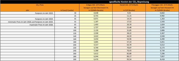 Bei den Energieträgern Heizöl und Flüssiggas sind die CO2-Kosten aufgrund der chemischen Zusammensetzung höher als bei Erdgas, bei Heizöl um 32,8 % und bei Flüssiggas um 17,1 %. Bei Heizöl und Flüssiggas ist zudem damit zu rechnen, dass sich bei hohen CO2-Preisen auch die Mehrkosten der CO2-Bepreisung aus der Logistikkette im Verkaufspreis der Energieträger abbilden.