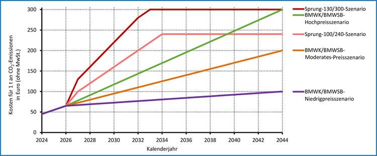 Im Sprung-100/240-Szenario springt der CO2-Preis im Jahr 2027 auf 100 Euro/t und steigt danach pro Jahr um 20 Euro/t bis maximal 240 Euro/t.