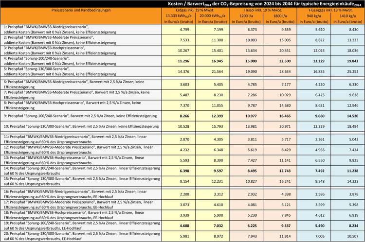 Im dritten Block (11 bis 15) wurden die in den Jahren 2024 bis 2044 anfallenden CO2-Kosten wie zuvor mit einem Zinssatz von 2,5 %/a als Barwert auf den 1. Januar 2024 bezogen. Zusätzlich wurde angenommen, dass in den 20 kommenden Jahren eine Minderung des Jahresverbrauchs um 40 % erreicht wird. Die Minderung wird als kontinuierlicher Erfolg linear auf den Zeitraum 2025 bis 2044 aufgeteilt. Das entspricht einer mittleren Einsparung von 20 %. Für das Einfamilienhaus liegen die so ermittelten CO2-Kosten im optimistischsten „BMWK/BMWSB-Niedrigpreisszenario“ in einem Bereich von 4.305 Euro (Erdgas) bis 5.717 Euro (Heizöl). Im teuersten „Sprung-130/300-Szenario“ sind die CO2-Kosten 2,84-mal höher. Im „Sprung-100/240-Szenario“ liegen die CO2-Kosten zwischen 9.597 Euro (Erdgas) und 12.743 Euro (Heizöl).