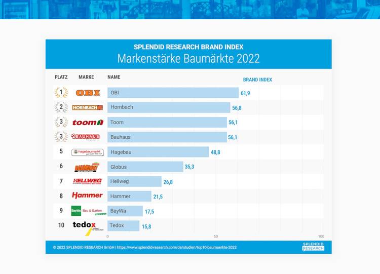 Einer aktuellen repräsentativen Studie zufolge ist Obi die stärkste Marke unter den Baumärkten. Hornbach liegt auf Platz zwei, Toom und Bauhaus (punktgleich) folgen in dem von Splendid Research durchgeführten Top 10 Ranking auf dem dritten Platz. Ferner gibt die Studie Aufschluss darüber, warum die Marke Tedox mit dem besten Image aufwarten kann.