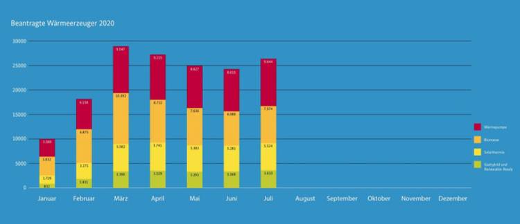 45,6 % der 2020 gestellten Förderanträge wurden inklusive der neu eingeführten Öl-Austauschprämie (59.607) gestellt. Am häufigsten wurde bis Ende Juli die Förderung einer Wärmepumpe (55.405) beantragt.