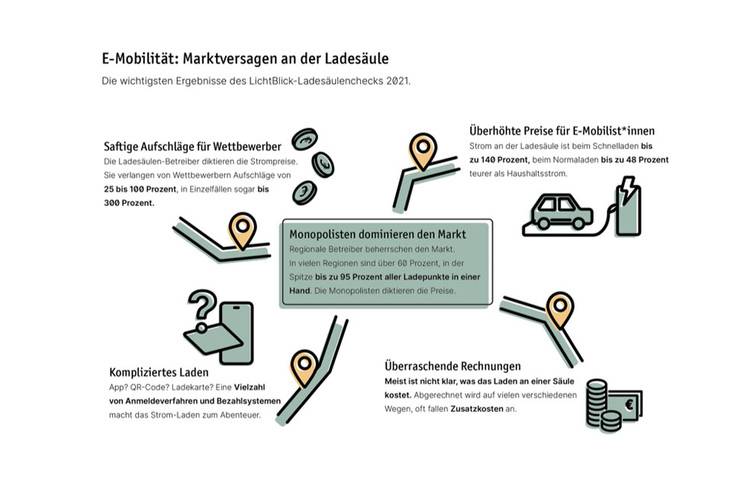 Die zunehmende Monopolbildung im Ladesäulenmarkt treibt die Strompreise für Elektroautos in die Höhe und verhindert echten Wettbewerb. Für E-Mobilist*innen kostet der Strom an der Ladesäule bis zu 140 Prozent mehr als im Haushalt. Auch an anderer Stelle wird es teuer: Die Ladesäulenbetreiber verlangen von konkurrierenden Fahrstromanbietern Preisaufschläge von 25 bis 100 Prozent, in der Spitze sogar 300 Prozent. Das geht aus dem neuen LichtBlick-Ladesäulencheck 2021 hervor.