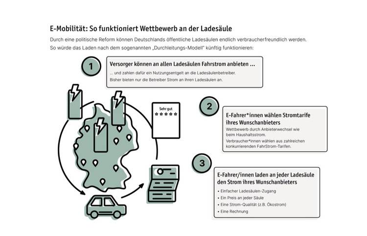 LichtBlick fordert von der Politik eine grundlegende Marktreform. Trotz einer Vielzahl von mehr als 1.000 Ladesäulenbetreibern in Deutschland gibt es keinen Wettbewerb. Während heute nur der Betreiber Strom an seine Säulen liefert, sollen die Ladepunkte künftig allen Stromanbietern offenstehen. Ein entsprechendes Modell der Bundesnetzagentur trat zum 1. Juni 2021 in Kraft. Es ist allerdings nicht verpflichtend. Technisch wäre dieser Schritt ohne Umrüstung der bestehenden Ladesäulen möglich. Verbraucher*innen könnten dann frei ihren Fahrstrom-Tarif wählen. Sie könnten an jeder öffentlichen Säule zwischen Flensburg und München mit einer Ladekarte oder App zu einem Preis und auf eine Rechnung laden.