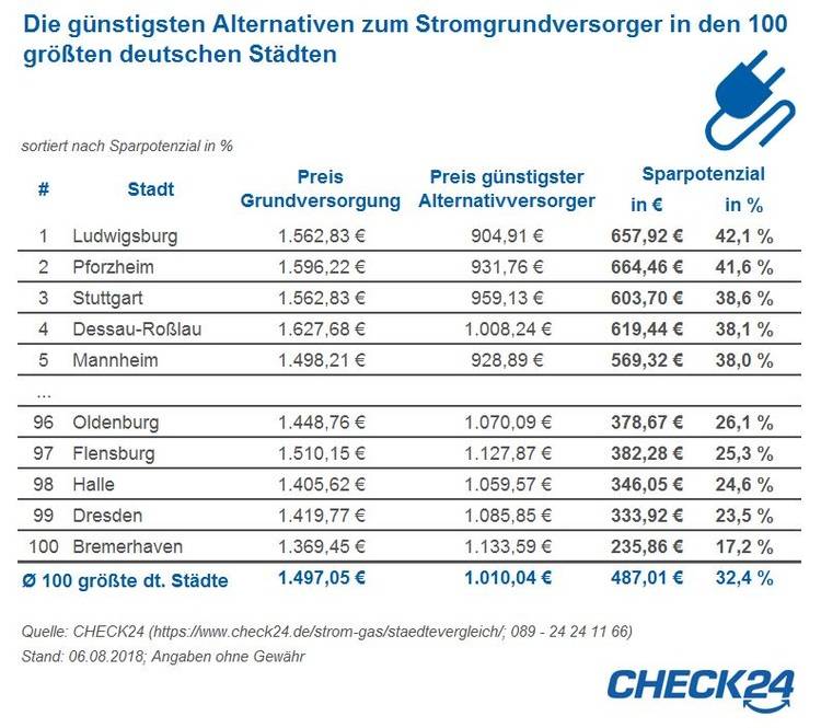 In den 100 größten deutschen Städten spart eine Familie mit einem Stromverbrauch von 5.000 kWh im Durchschnitt 487 Euro oder 32 Prozent, wenn sie aus der Grundversorgung zum günstigsten Alternativversorger wechselt.