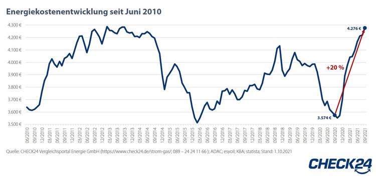Die Preise für Strom, Heizen und Mobilität sind auf Rekordniveau. Die jährlichen Energiekosten für einen Musterhaushalt lagen im September 2021 bei durchschnittlich 4.276 Euro. Das sind 20 Prozent bzw. 702 Euro mehr als im Vorjahresmonat. Im September 2020 betrugen die Kosten noch 3.574 Euro.