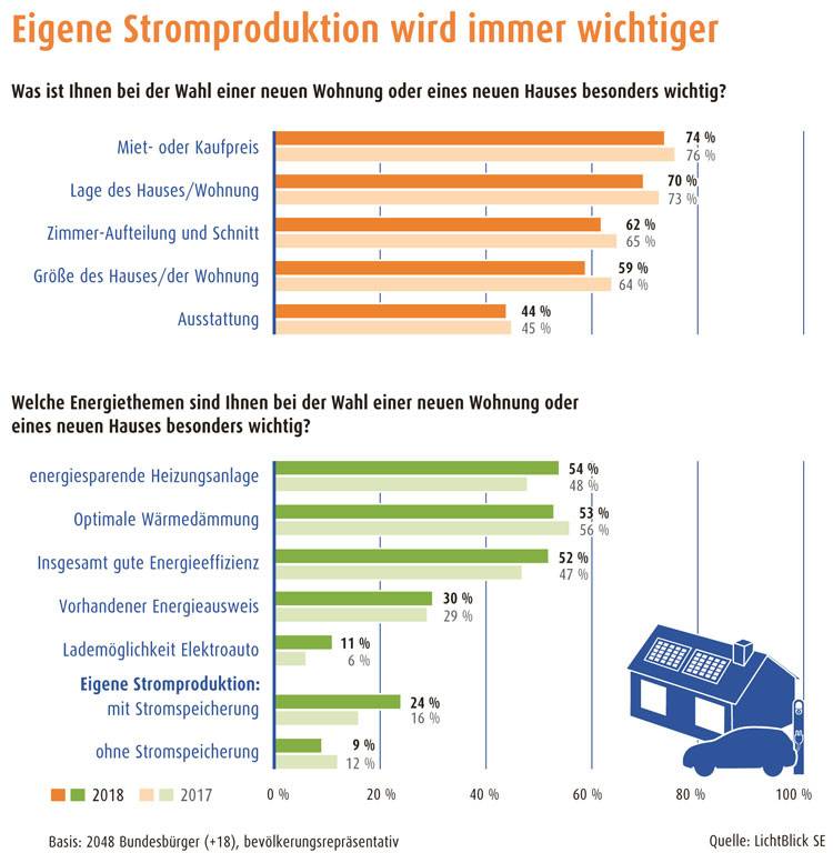 „Geringere Heizkosten sind der Klassiker bei der Suche nach einem neuen Haus oder einer neuen Wohnung. Gestiegene Energiepreise verstärken diesen Trend,“ so Gero Lücking, Geschäftsführer Energiewirtschaft bei LichtBlick. „Doch immer mehr Menschen wollen ihr Zuhause auch gut für die Zukunft gerüstet wissen und setzen auf eigene Solaranlagen, Speicher oder die Möglichkeit, in Zukunft ein E-Auto mit Eigenstrom laden zu können.“