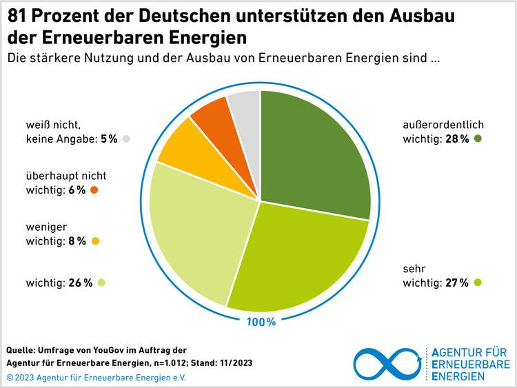 81 Prozent der deutschen Bevölkerung stehen hinter dem Ausbau der Erneuerbaren Energien. „Unsere Umfrage zeigt einmal mehr, dass die Zustimmung der Bevölkerung gegenüber den Erneuerbaren sehr hoch ist“, sagt AEE-Geschäftsführer Dr. Robert Brandt. „Dieses klare Ja zur Energiewende gibt der Politik Rückendeckung zur weiteren und vor allem auch schnelleren Umsetzung der Transformation. Sie ist essenziell, um unsere Wirtschaft zukunftsfähig zu machen, unser Klima zu schützen, die Kommunen und Regionen wirtschaftlich zu stärken und die Gesundheit der Menschen hierzulande zu bewahren.“