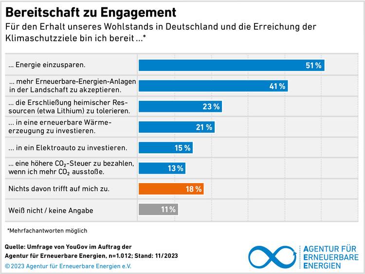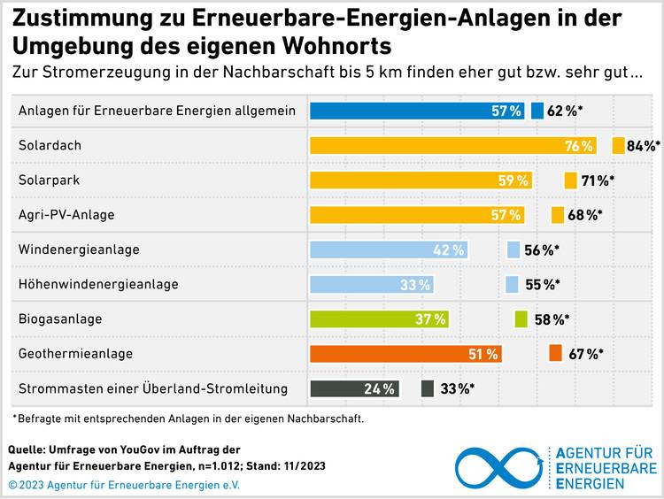Das zeigt die aktuelle, repräsentative Akzeptanzumfrage 2023 der Agentur für Erneuerbare Energien (AEE), die vom Meinungsforschungsinstitut YouGov durchgeführt wurde.