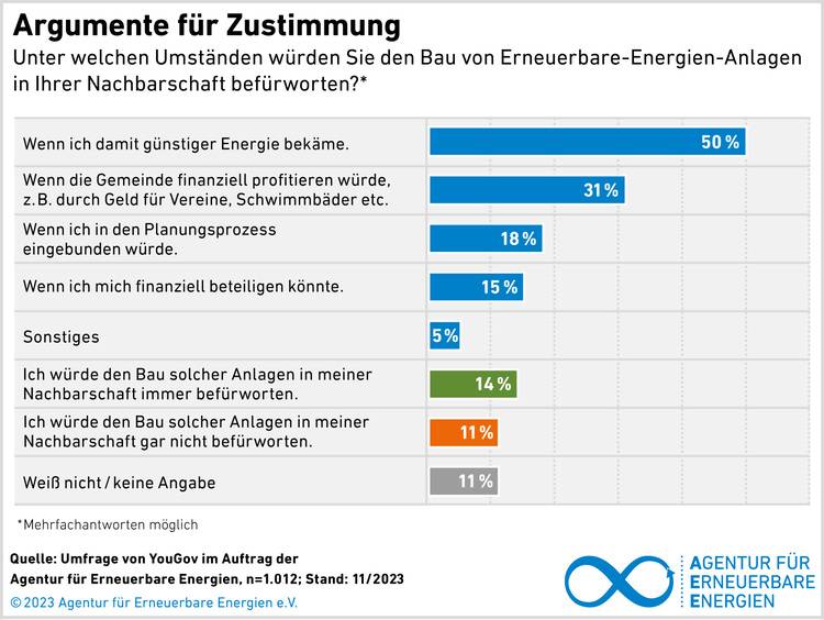 Auf die Frage „Unter welchen Umständen würden Sie den Bau neuer Erneuerbare-Energien-Anlagen in Ihrer Nachbarschaft befürworten“, gaben 50 Prozent der Teilnehmenden an: „Wenn ich damit günstiger Energie bekäme“. 31 Prozent unterstützen es, „wenn die Gemeinde finanziell davon profitieren würde“. 14 Prozent gaben sogar an, den Bau solcher Anlagen auch ohne bestimmten Vorteil zu unterstützen, während lediglich elf Prozent dies grundsätzlich nicht befürworten würden.
