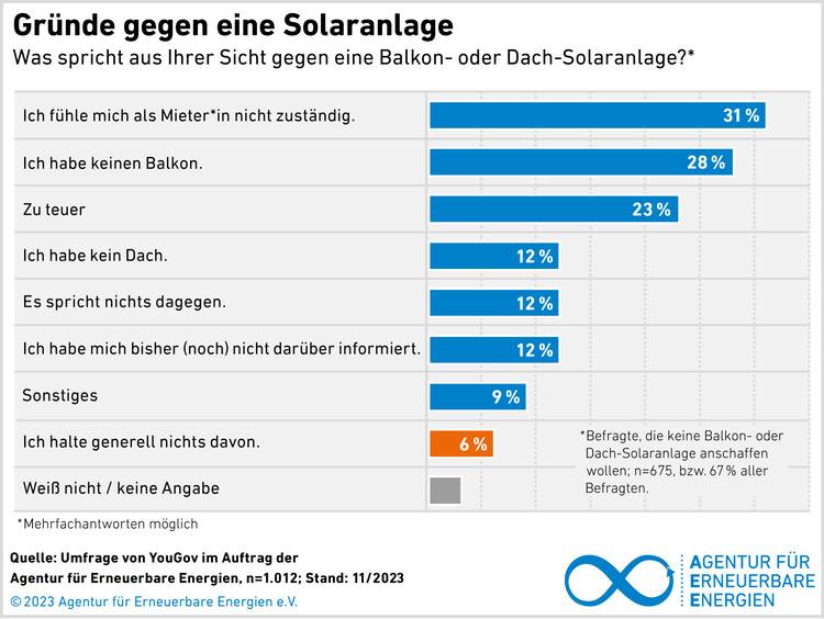 Unter denjenigen, die angegeben haben, keine solche Anschaffung zu planen (jeweils 54 %), haben wir in unserer Akzeptanzumfrage nach den Gründen hierfür gefragt. Ein Großteil dieser Personen, nämlich 31 Prozent, fühlt sich schlicht als Mieter*in nicht für den Kauf oder die Miete einer Solaranlage für Dach oder Balkon zuständig. 40 Prozent nannten als Grund, dass sie über kein eigenes Dach oder keinen eigenen Balkon verfügen. Jeweils 12 Prozent gaben an, dass sie keine Einwände oder sich bisher nicht ausreichend informiert haben. Lediglich sechs Prozent sprachen sich grundsätzlich dagegen aus. 23 Prozent sind Solaranlagen zu teuer.