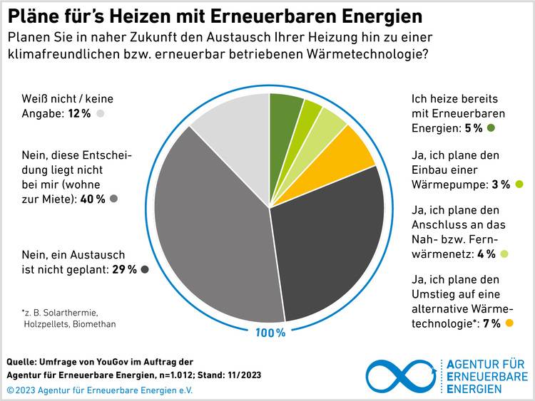 Ein sehr wichtiger Prozess der Energiewende ist das Vorantreiben der Wärmewende. Raumwärme, Prozesswärme und Warmwasser machen ungefähr die Hälfte des Energieverbrauchs in Deutschland aus. Umso dringender war es, hier einen politischen Rahmen zu setzen und den erneuerbaren Weg einzuschlagen. Fünf Prozent der Bürger*innen heizen der Akzeptanzumfrage nach bereits erneuerbar. 40 Prozent betonten, dass sie selbst diese Entscheidung nicht treffen könnten, da sie zur Miete, in einer Wohngemeinschaft oder Ähnlichem wohnen. Fast ein Drittel gab an, keinen Austausch ihrer fossilen Heizung zu planen. Erst 14 Prozent planen in naher Zukunft den Umstieg auf eine klimafreundliche Wärmetechnologie.