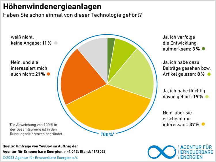 Neu hinzugekommen zur AEE-Akzeptanzumfrage als Technologie sind in diesem Jahr die Höhenwindenergieanlagen, auch HWE-Anlagen genannt. Deren Bau in der Nachbarschaft würde von 33 Prozent der Bürger*innen befürwortet werden. Diese Anlagen nutzen zur Stromerzeugung automatisierte Fluggeräte oder Drachen, die an Seilen befestigt sind. Eine Technologie, die noch nicht stark in der breiten Öffentlichkeit diskutiert wird, wie sich auch in unserer Umfrage zeigt. 37 Prozent der Befragten gaben an, bisher noch nichts von HWE-Anlagen gehört zu haben, aber sie interessant zu finden. 19 Prozent hatten bereits flüchtig etwas davon gehört und ein kleiner Teil verfolge die Entwicklung aufmerksam (3 %) beziehungsweise habe dazu bereits etwas gelesen oder gesehen (8 %).