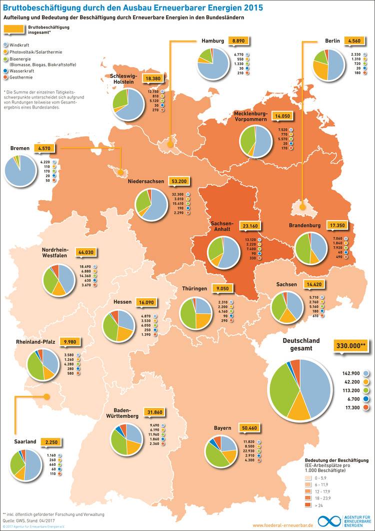 Insgesamt waren in Deutschland im Jahr 2015 direkt und indirekt 330.000 Menschen durch den Ausbau Erneuerbarer Energien beschäftigt. Die meisten dieser Arbeitsplätze sind in den großen Flächenstaaten entstanden: Niedersachsen führt dabei mit über 53.000 Erneuerbaren-Jobs vor Bayern (50.460) und Nordrhein-Westfalen (44.030).