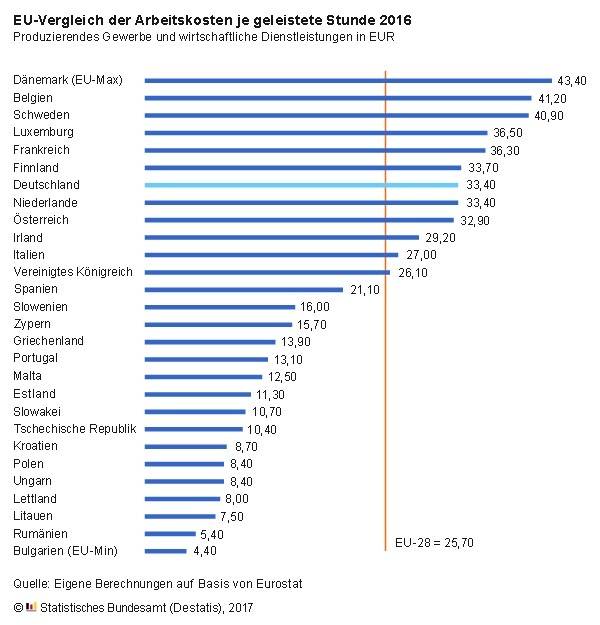 Gemessen am EU-Durchschnitt von 25,70 Euro zahlten deutsche Arbeitgeber 30 % mehr für eine Stunde Arbeit. Im Vergleich beispielsweise zum Nachbarland Frankreich (36,30 Euro) waren es aber knapp 8 % weniger. Dänemark hatte mit 43,40 Euro die höchsten Arbeitskosten je geleistete Stunde, Bulgarien mit 4,40 Euro die niedrigsten.