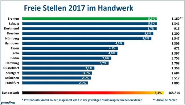 Die wenigsten freien Stellen für Handwerker waren 2017 in Bremen (1.160), Dortmund (916) und Essen (671) ausgeschrieben.
