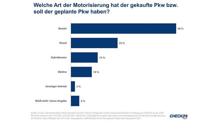 Die Tankkosten für E-Autos beim Laden zu Hause sind also vergleichsweise gering. Eine repräsentative YouGov-Umfrage im Auftrag von Check24 kommt dennoch zu folgendem Ergebnis: Nur zehn Prozent der Befragten, die sich in den vergangenen zwölf Monaten einen Pkw gekauft haben oder dies planen, haben ein Elektroauto gekauft oder planen dies. 50 Prozent haben sich für einen Benziner entschieden bzw. planen den Kauf, bei 22 Prozent fällt die Wahl auf einen Pkw mit Dieselmotor und bei 13 Prozent auf einen Hybrid.