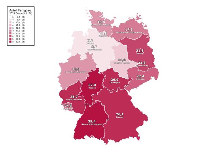 Ein drittes Bundesland, das die 30-Prozent-Marke übertroffen hat, ist Berlin. Zwar wurden hier insgesamt „nur“ 443 Fertighäuser genehmigt, allerdings waren das 70 % mehr Fertighäuser als 2020. Die Fertigbauquote stieg in der Bundeshauptstadt auf 31,8 % an (2020: 21,5 % - 260). Am geringsten war der Marktanteil des Fertigbaus an neu genehmigten Ein- und Zweifamilienhäusern 2021 in Niedersachsen und Bremen.