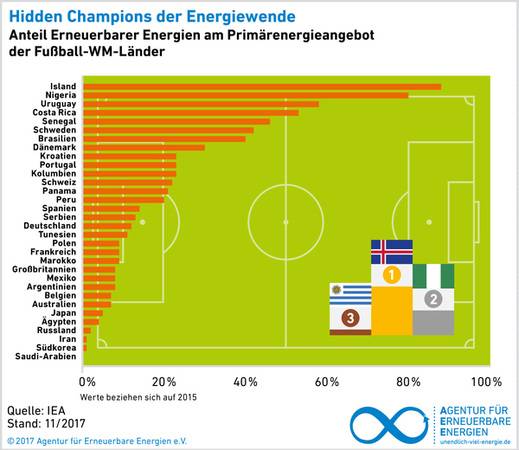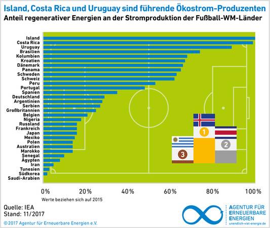 Für das Regenerativ-Ranking der WM-Matadoren wurden die Anteile Erneuerbarer Energien am Primärenergieangebot und an der Stromproduktion aller Teilnehmerländer für das Jahr 2015 herangezogen. In beiden Kategorien ist Island vorn, da es seinen Strombedarf vollständig mit Wasserkraft und Erdwärme deckt. Bei der Fußball-EM 2016 hatten die Isländer mit ihrem Schlachtruf „Huh“ gezeigt, welche Kraft sie mobilisieren können. Das ist auch nötig: Laut FIFA-Schätzung verbraucht ein Fußballspieler pro Partie rund 6,5 Megajoule, das entspricht etwa 1,8 Kilowattstunden (kWh). Legt man diesen Wert für alle 22 Spieler auf dem Platz und die Unparteiischen zugrunde, multipliziert mit 64 WM-Partien, so ergibt sich ein Energieverbrauch der Aktiven auf dem Spielfeld von knapp 3.000 kWh. Das entspricht etwa dem jährlichen Strombedarf eines Familienhaushaltes in Deutschland. „Wie die Fußballer sich körperlich und mental von Spiel zu Spiel erneuern, so sollte die Fußball-WM Ansporn für alle sein, voll auf Erneuerbare Energien zu setzen“, erklärt Vohrer.